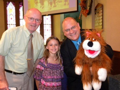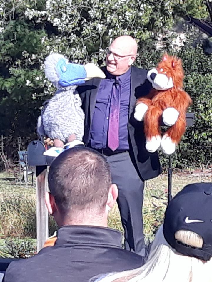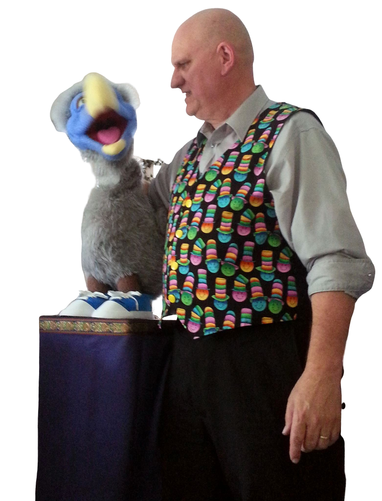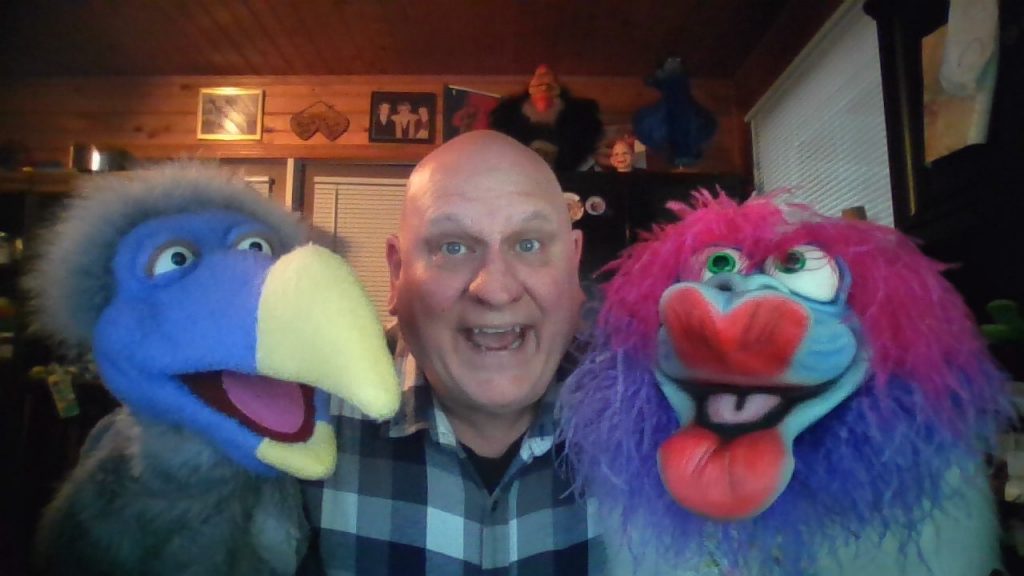 Today Daniel uses soft puppets for his performances and, every once in a while will have Ziff join him. The soft puppet he has are mostly custom made by MAT Puppets and a few that are designed by Axtell Expressions. Pictured is Gill the Bird (MAT Puppets), Daniel Jay and W.T (Axtell Expressions).